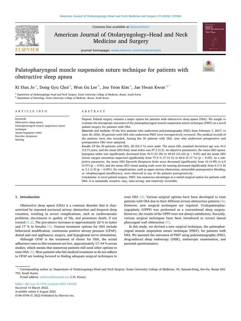 [수면 관련 논문 발표]American Journal of Otolaryngology-Head and Neck Medicine and Surgery